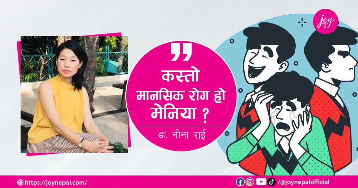यसैमध्यको एक हो, मेनिया । यसलाई एन्जाइटी, डिप्रेसन भन्दापनि जटिल रोगका रुपमा लिइन्छ । तर यसका बारेमा त्यति धेरै चर्चा भएको पाइँदैन । यो कस्तो रोग हो, लक्षण के के हुन् लगायतका विषयमा टिचिङ अस्पतालमा कार्यरत चिकित्सक डा. नीना राईसँग जोय नेपालका लागि सुस्मिता फुयाँलले गरेको कुराकानी: