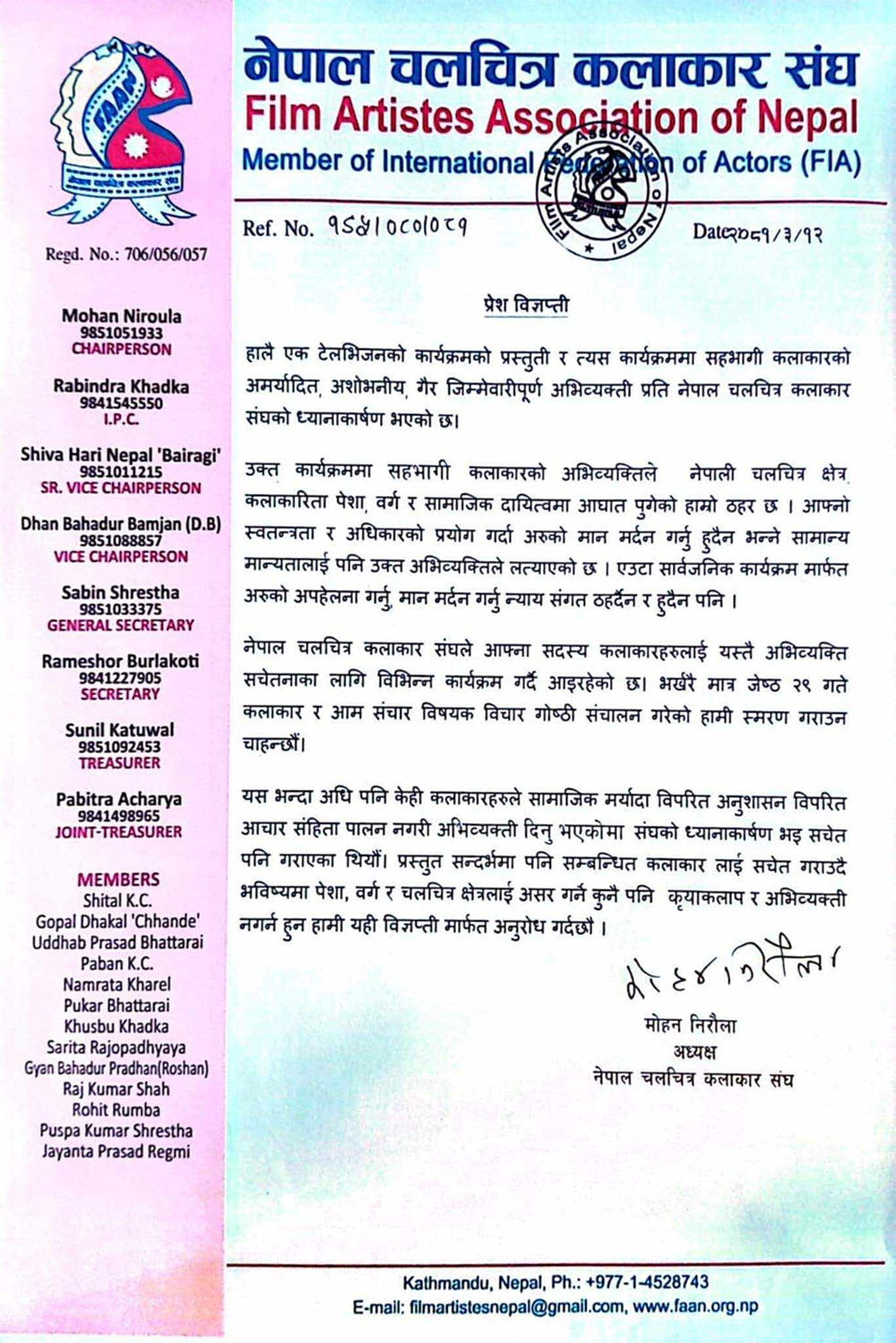 साथै कलाकार संघले संघले यसबारेमा विवादित कलाकारलाई सचेत गराएको पनि जनाएको छ ।