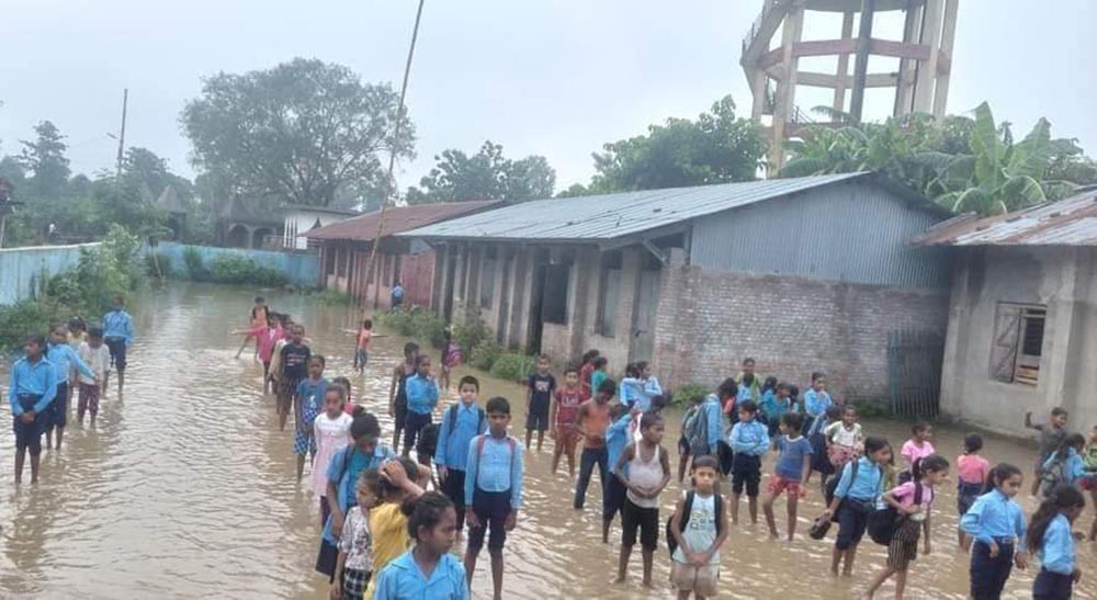 दुर्गा भगवती १ स्थित जनता प्राथमिक विद्यालयको कक्षाकोठा र प्राङ्गणमा समेत पानी जमेर विद्यार्थीहरू समस्यामा परेका हुन् । विद्यालय प्राङ्गणमा डेढ दुई फिटसम्म पानी जमेपछि बिस्तारै कक्षा कोठामा समेत छिरेपछि पठनपाठन प्रभावित भएको प्रधानाध्यापक मुकेश चौधरीले बताए ।