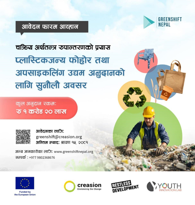 यूरोपिएन यूनियन (ईयु) को सहयोगमा क्रिएसन नेपालद्धारा सन्चालित ग्रिनसिफ्ट परियोजना अन्तर्गत तीन प्रदेशका ६ निजी प्लास्टिकजन्य फोहोरमैला उद्यम सञ्चालन गरी रहेका संस्थालाई प्रदान गरिने परियोजनाका प्रमुख युनिस घिमिरले जानकारी दिए । बागमती प्रदेशबाट तीन, मधेश प्रदेशबाट दुई र लुम्बिनी प्रदेशबाट एक गरी जम्मा ६ प्लास्टिकजन्य फोहोरमैला उद्यम सन्चालन गरीरहेका निजी संस्थालाई मूल्याकंनका आधारमा उक्त अनुदान प्रदान गरिने उनले बताए । छनौट भएका प्रति उद्यमलाई २० लाखका दरले अनुदान रकम प्रदान गरिनेछ ।
