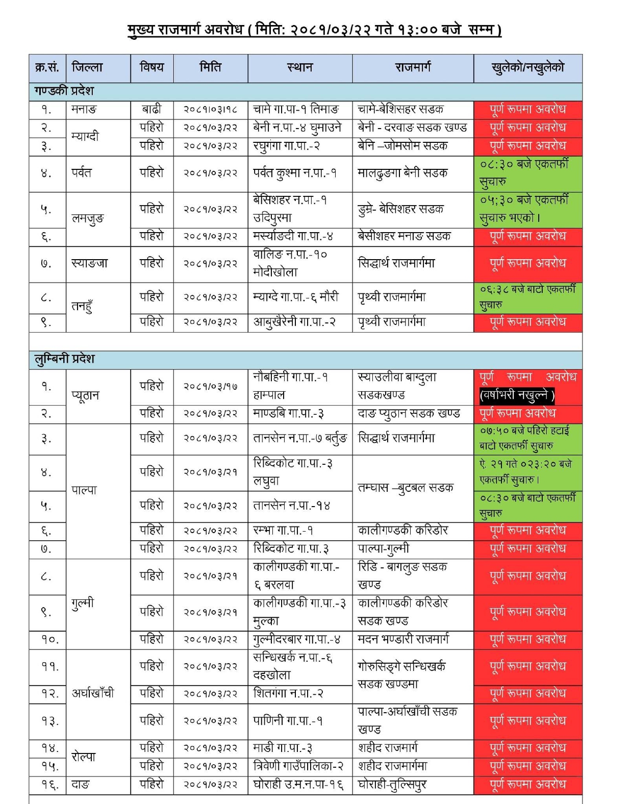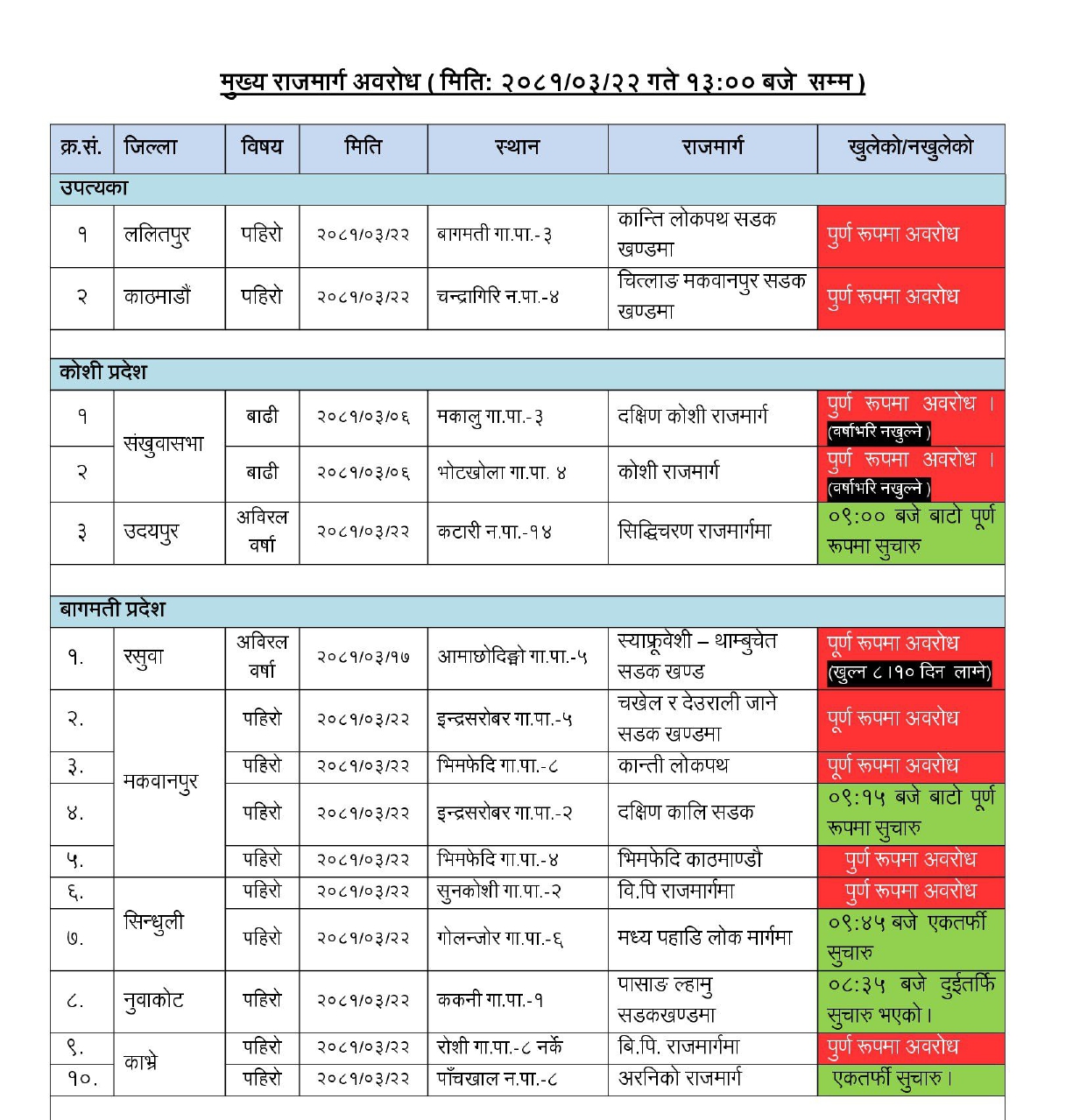प्रहरीले दिएको जानकारी अनुसार ललितपुरको कान्ति लोकपथ सडक खण्ड र काठमाडौँमा चित्लाङ मकवानपुर सडक खण्ड पूर्ण रुपमा अवरुद्ध भएका छन् ।