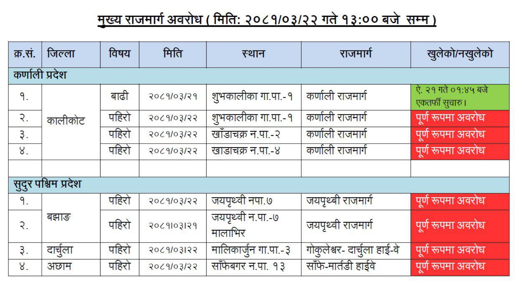 प्रहरीका अनुसार मुख्य राजमार्गहरु पनि पहिरोका कारण अवरुद्ध भएका छन् । कर्णाली राजमार्गका कतिपय स्थानमा पूर्ण रुपमा अवरोध भएको छ ।