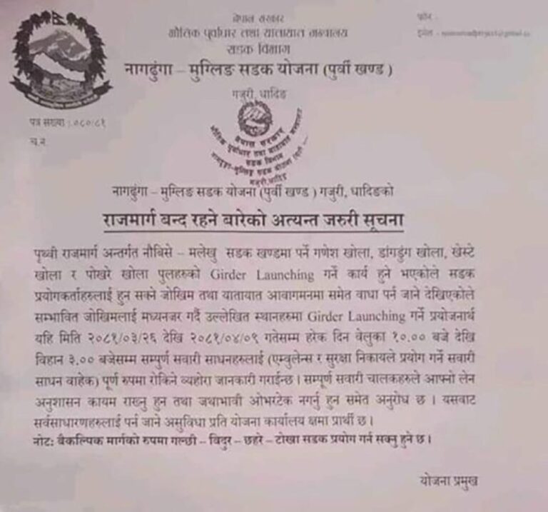 आजदेखि आगामी साउन ९ गतेसम्म रातिको समयमा निर्माणको काम गर्न लागिएको हो । राति १० बजेदेखि बिहान ३ बजेसम्म राजमार्ग बन्द गरेर पुलको बिम राख्ने कार्य गर्न लागिएको नागढुङ्गा मुग्लिन सडक आयोजना (पूर्वी खण्ड)का सिनियर डिभिजन इन्जिनियर ईश्वरबहादुर रिजालले जानकारी दिएका छन् ।
