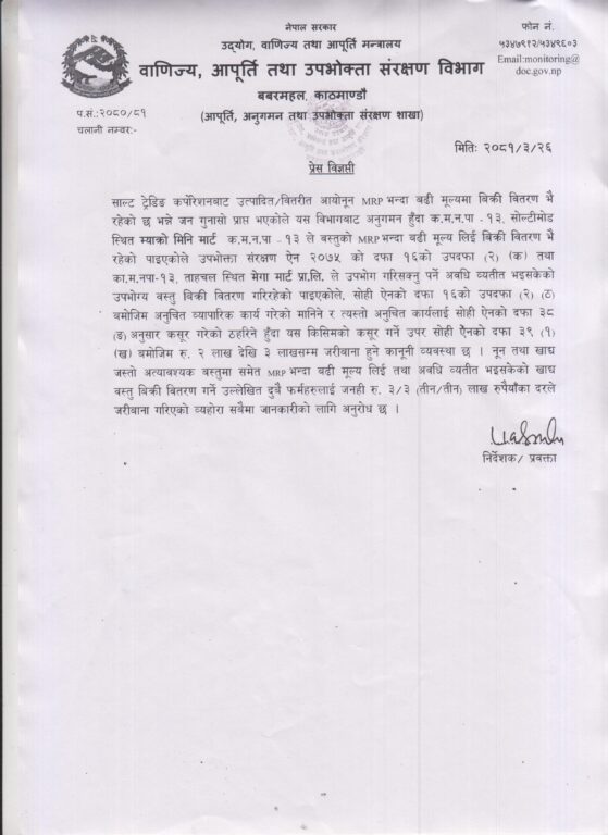 काठमाडौं महानगरपालिका वडा नम्बर १३ सोल्टीमोडस्थित म्याक्रो मिनिमार्टले साल्टट्रेडिङ कर्पोरेसनबाट वितरित आयोडिनयुक्त नुन अधिकतम खुद्रा मूल्यभन्दा बढी लिई बिक्रीवितरण गरेको तथा ताहाचलस्थित मेगा मार्ट प्रालिले उपभोग्य गरिसक्नुपर्ने अवधि व्यतीत भइसकेका वस्तु बिक्रीवितरण गरेको भेटिएको विभागले जनाएको छ।