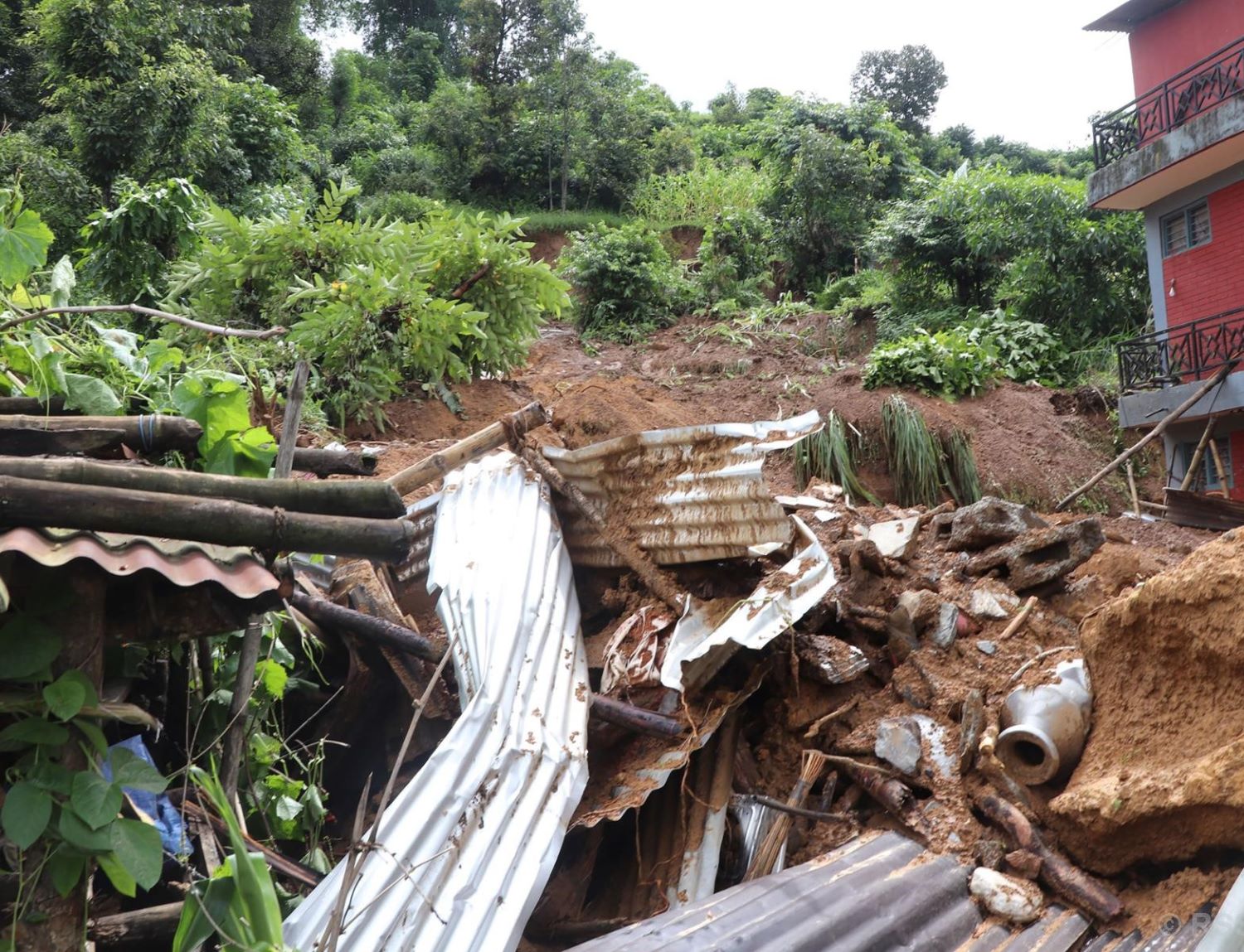 पोखरा महानगरपालिका–१९ पुरुनचौर तल्लाकोटमा गएराति अविरल वर्षापछिको पहिरोमा पुरिएको कुलबहादुर परियारको घर । सो पहिरोमा परी कुलबहादुर सहित उनका परिवारका छ जना र छिमेकी एक गरी सात जनाको मृत्यु भएको छ । तस्बिर : कृष्ण दवाडी/रासस