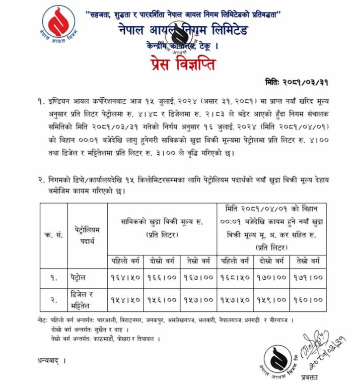 बढेको मुल्य सोमबार राति १२ बजेदेखि लागु हुने छ । मुल्य बढेपछि अब काठमाडौँ उपत्यकामा पेट्रोल प्रति लिटर १७१ रुपैयाँ भएको छ र भने डिजेल तथा मट्टीतेल प्रतिलिटर १६० भएको छ । निगमले भारतबाट आएको नयाँ मुल्य सूची बढेर आएकोले मुल्य बढाउनु परेको जानकारी दिएको छ ।
