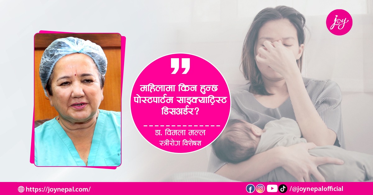 यो ‘डिसअर्डर’ हुने दर अझ विकसित मुलुकमा उच्च छ । सुत्केरी महिलाहरुमा हुने पोस्टपार्टम साइक्याट्रिस्ट डिसअर्डर के हो, यो कसरी र हुन्छ र यसको प्रभावले महिलाहरुको शारीरिक तथा सामाजिक जीवनमा के–कस्ता असरहरु पर्छन्’ भन्ने सन्दर्भमा स्त्रीरोग विशेषज्ञ डा. विमला मल्लसँग जोय नेपालका लागि सुस्मिता फुयाँलले गरेको कुराकानीको सम्पादित अंश: