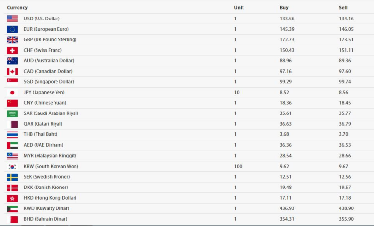 अमेरिकी डलर एकको खरिद दर १३३ रुपैयाँ ५६ पैसा र बिक्री दर १३४ रुपैयाँ १६ पैसा पुगेको छ। युरो एकको खरिद दर १४५ रुपैयाँ ३९ पैसा र बिक्री दर १४६ रुपैयाँ ०५ पैसा रहेको छ।