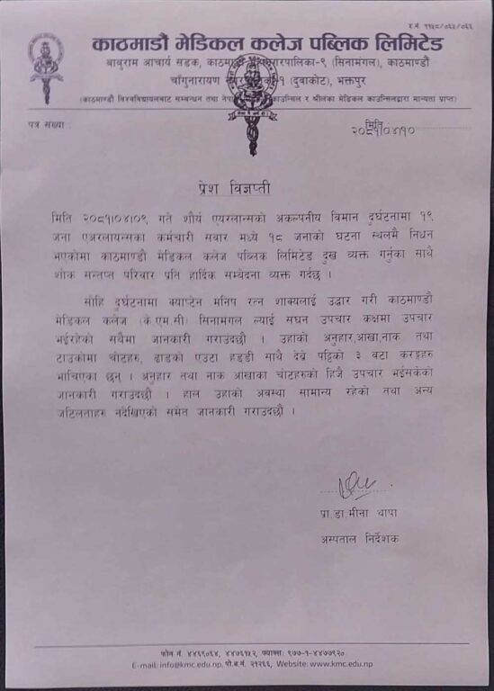 “क्याप्टेन शाक्यको स्वास्थ्य अवस्था सामान्य छ । उनको अनुहार, आँखा, नाक तथा टाउकोमा चोट लागेको छ, ढाडको एउटा हड्डी साथै देव्रेपट्टीका तीन वटा करङ्ग भाच्चिएका छन्”, विज्ञप्तिमा भनिएको छ । अस्पतालले विमान दुर्घटनामा मृत्यु भएकाप्रति दुःख व्यक्त गर्दै शोक सन्तप्त परिवारमा हर्दिक समवेदना व्यक्त गरेको छ ।