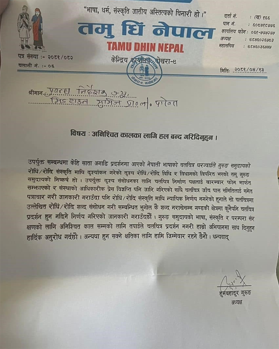 तमु धिं नेपालले एक विज्ञप्ति जारी गर्दै अनिश्चित कालका लागि फिल्म नचलाउन चेतावनी दिएको हो ।