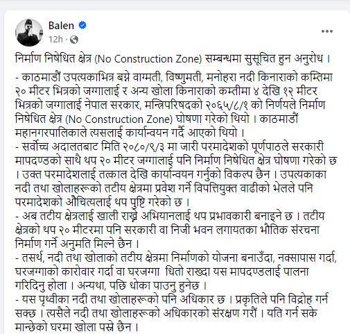 काठमाडौँमा बाढीले तटीय क्षेत्रमा ठुलो क्षति पुर्याएपछि उनले काठमाडौँका नदी–खोलाका तटीय क्षेत्रलाई खाली राख्ने अभियानलाई अब थप प्रभावकारी बनाइने प्रष्ट पारेका हुन् । बालेनले मापदण्डलाई पालना नगरे महानगरले उचित कदम चाल्ने चेतावनी समेत दिएका छन् ।