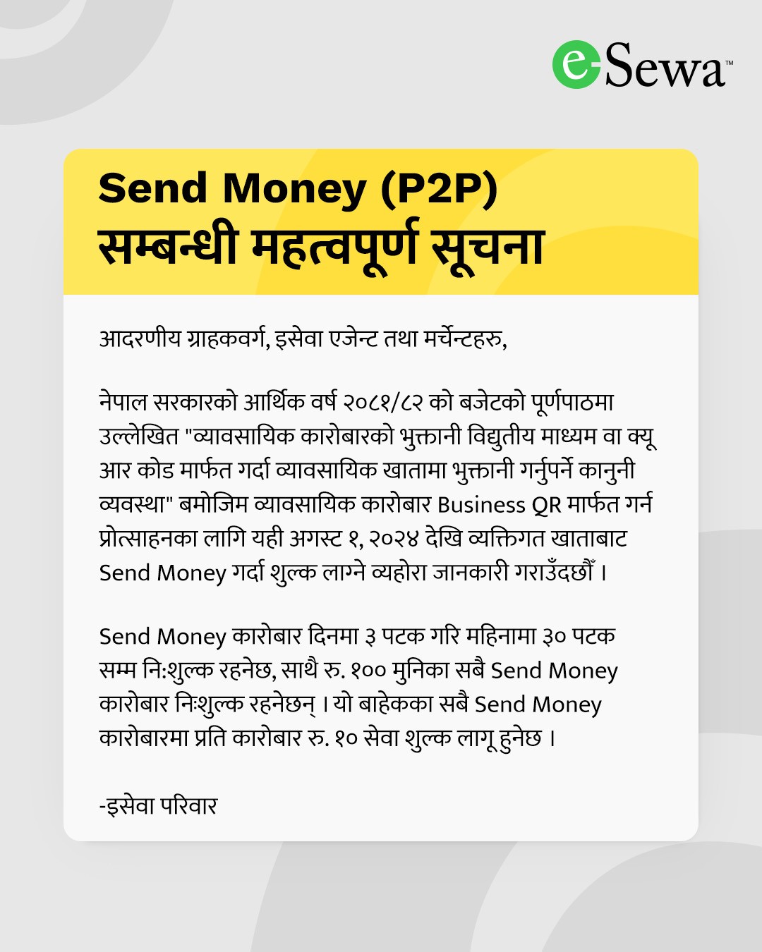 ‘नेपाल सरकारको आर्थिक वर्ष २०८१/८२ को बजेटको पूर्ण पाठमा उल्लेखित व्यावसायिक कारोबारको भुक्तानी विद्युतीय माध्यम वा क्यूआर कोडमार्फत गर्दा व्यावसायिक खातामा भुक्तानी गर्नुपर्ने कानूनी व्यवस्था बमोजिम व्यावसायिक कारोबार मार्फत गर्न प्रोत्साहनका लागि यही अगस्ट १ देखि व्यक्तिगत खाताबाट सेण्ड मनी गर्दा शुल्क लाग्ने व्यहोरा जानकारी गराउँछौँ ।,’ इसेवाले जारी गरेको विज्ञप्तिमा भनिएको छ ।