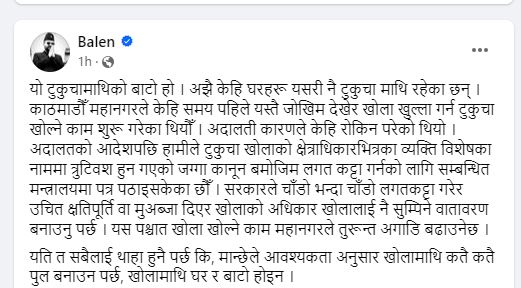 खोलामाथि सडक बनाउँदा भासिएको भन्दै सामाजिक सञ्जालमा पोस्ट गरेका उनले सरकारले चाँडोभन्दा चाँडो लगत कट्टा गरेर उचित क्षतिपूर्ति वा मुआब्जा दिएर खोलाको अधिकार खोलालाई नै सुम्पिने वातावरण बनाउनुपर्ने समेत बताएका हुन्।
