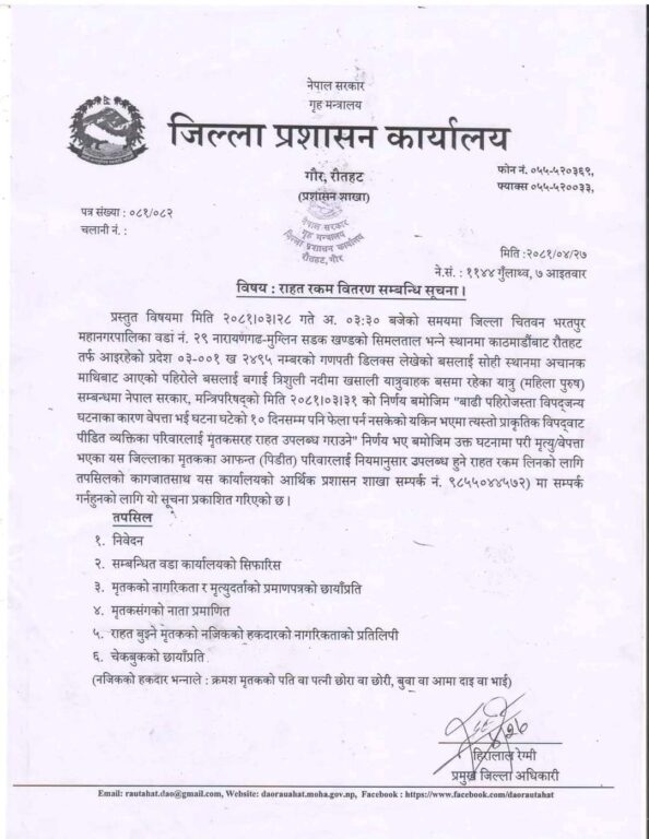 राहतको लागि आउँदा सम्बन्धित वडाको सिफारिस, मृतकको नागरिकता, मृत्यु दर्ताको फोटोकपी, नाता प्रमाणित, राहत वुझ्नेको नागरिकताको फोटोकपी, कुनै पनि बैंकको चेकाबुकको फोटोकपी अनिवार्य लिएर आउनु पर्ने जिल्ला प्रशासन कार्यालय रौतहट द्वारा जारी सूचनामा उल्लेख गरिएको छ।