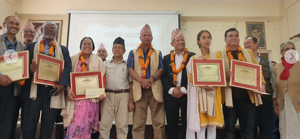 काठमाडौं– साहित्य सन्ध्याकोे ४५४ औँ विशेष शृङ्खला अन्तर्गत शनिबार पाँचजना साहित्यकारलाई ‘साहित्य सन्ध्या पुरस्कार तथा सम्मान’ प्रदान गरिएको छ ।