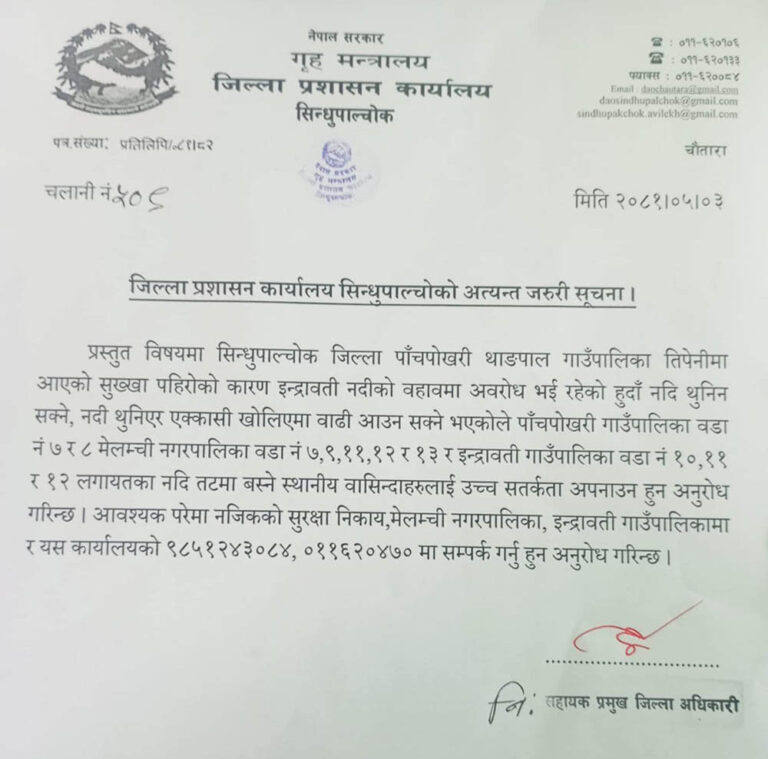 जिल्ला प्रशासन कार्यलय सिन्धुपाल्चोकले एक सूचना प्रकाशित गरि नदी थुनिन सक्ने भएकोले तल्लो तटीय क्षेत्रका नागरिकमा सावधानी अपनाउन र सुरक्षित रहन अनुरोध गरेको छ ।