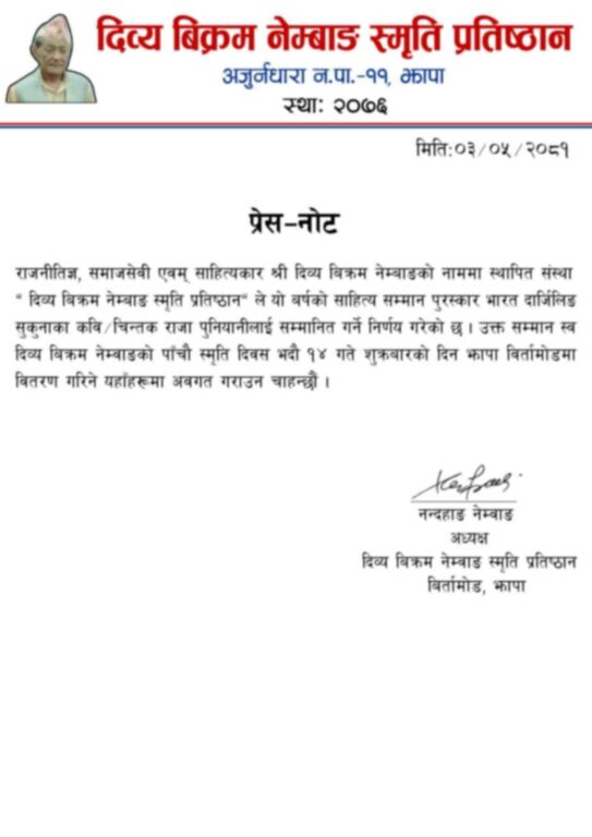 सम्मान पुरस्कार यही भदौ १४ गते दिव्य बिक्रम नेम्बाङको पाँचौं स्मृति दिवसका दिन झापाको विर्तामोडमा एक कार्यक्रम आयोजना गरी प्रदान गरिने प्रतिष्ठानका अध्यक्ष नन्दहाङ नेम्बाङले एक विज्ञप्ति जारी गरी बताएका छन् । २०७६ सालमा स्थापित स्मृति प्रतिष्ठानद्वारा प्रदान गरिने यो पुरस्कार यसअघि प्रकाश थाम्सुहाङ, कृष्ण बराल र उपेन्द्र सुब्बाले प्राप्त गरेका थिए । पुरस्कारको राशि तीस हजार रहेको छ ।