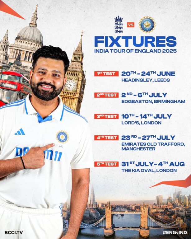 भारत र इंग्ल्याण्डबीचको पहिलो टेस्ट म्याच २० जुन २०२५ देखि लीड्समा खेलिनेछ। अन्तिम परीक्षा जुलाई ३१ मा हुनेछ। यसका अलावा टीम इन्डियाले बर्मिंघम, लर्ड्स र म्यानचेस्टरमा पनि टेस्ट म्याच खेल्नेछ। टेस्ट सिरिजको दोस्रो खेल जुलाई २ देखि ६ जुलाईसम्म बर्मिङ्घममै हुनेछ ।