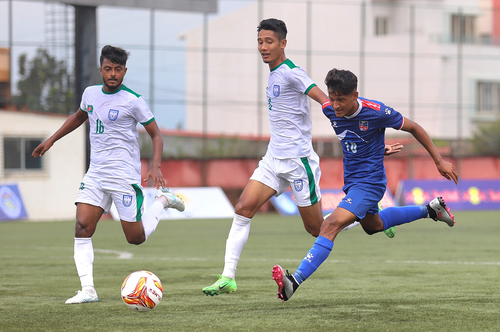 सातदोबाटोस्थित एन्फा कम्प्लेक्समा जारी खेलमा बंगलादेशले पहिलो हाफको इन्जुरी समयमा फ्री-किकबाट गोल गर्दै १-० को अग्रता लिएको हो ।
