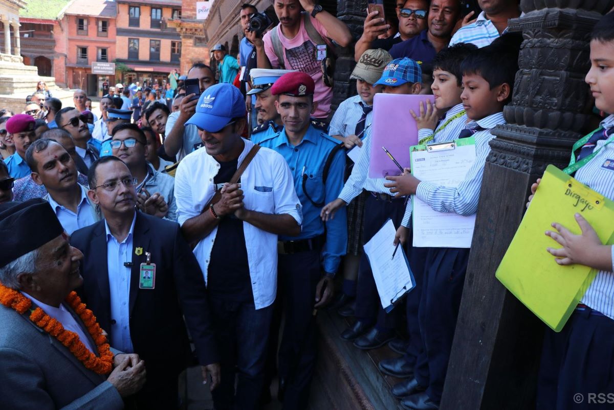 राष्ट्रपतिले अवलोकनका क्रममा आम नागरिकसँग कुराकानी गर्दै जनताको गुनासा सुनेका थिए । भक्तपुर दरबार स्क्वायर परिसरमा उनले विद्यार्थीसँग पनि कुराकानी गरेका थिए । त्यस अवसरमा उद्धव खड्काले २०७२ सालको भूकम्पले जीर्ण भइ टेकोका भरमा रहेको कला सङ्ग्रहालयदेखि अन्य सम्पदाको तत्काल पुनःनिर्माण गर्न पहल गरिदिन आग्रह गरेका थिए ।