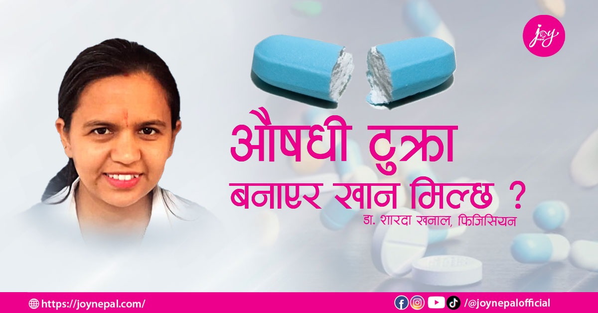 तपाईंले चिकित्सकको परामर्शअनुसार औषधि टुक्रा गरेर खान मिल्छ । तर आफूखुसी औषधिको डोज घटाउन वा बजारमा एउटै एमजीको औषधि नपाउँदा आधा चक्की खाने त्यस्तो गर्नु हुँदैन । किनकि सबै औषधि आधा टुक्रा गरेर खानुहुँदैन । कुन औषधि टुक्रा गरेर मिल्छ र कुन नखाने भन्नेमा धेरैलाई जानकारी नहुन सक्छ ।