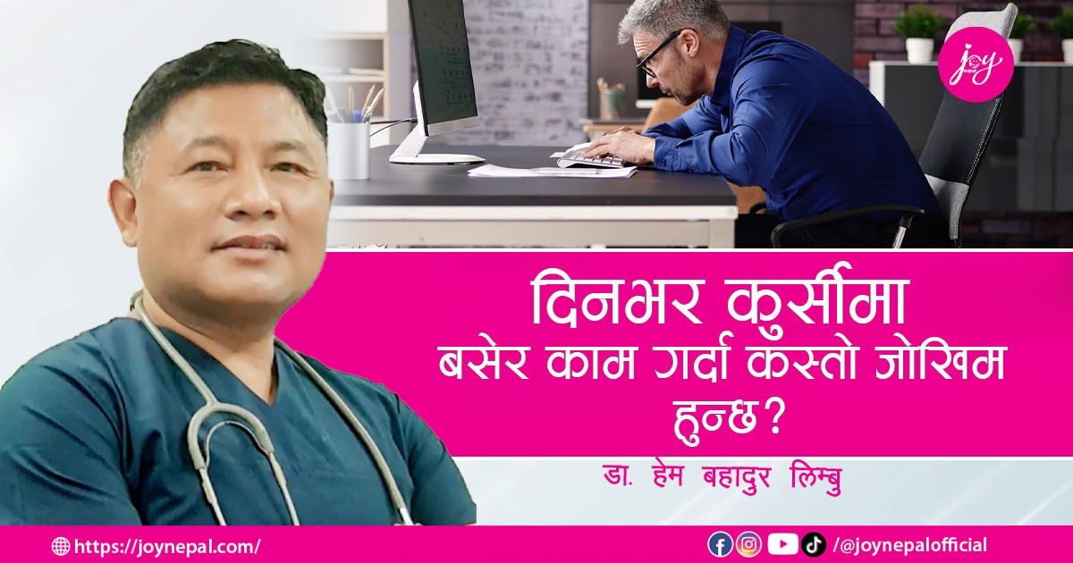 कुर्सीमा बसेर काम गर्नेहरुलाई ढाड, नशा, हाडजोर्नी लगायत अन्य विविध समस्याहरु देखा पर्ने गर्छन् । यसकारण दिनभर एकैठाउँमा, एकै पोजिसनमा बसेर काम गर्ने मानिसहरुलाई के कस्ता स्वास्थ्य समस्याहरुले सताउँछन् भन्ने सन्दर्भमा अर्थोपेडिक डा. हेम बहादुर लिम्बुसँग जोय नेपालका लागि सुस्मिता फुयाँलले गरेको कुराकानीः