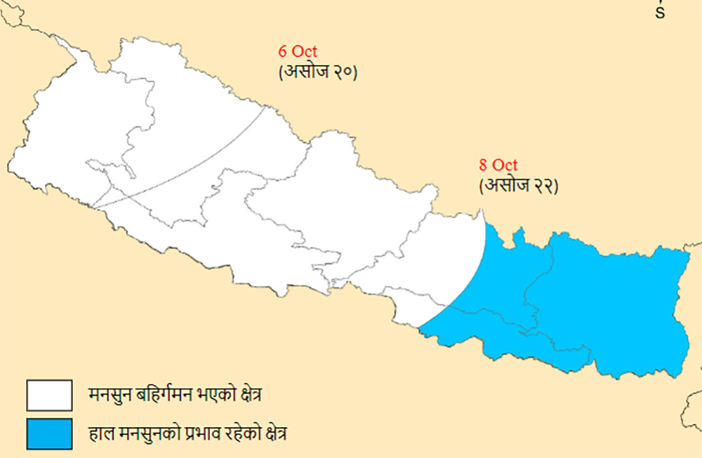 मौसम पूर्वानुमान महाशाखाका अनुसार काठमाडौँ उपत्यकासहित बागमती प्रदेश, कर्णाली प्रदेश, लुम्बिनी प्रदेश र गण्डकी प्रदेशका सम्पुर्ण भू-भागबाट मनसुन बाहिरिएको हो ।