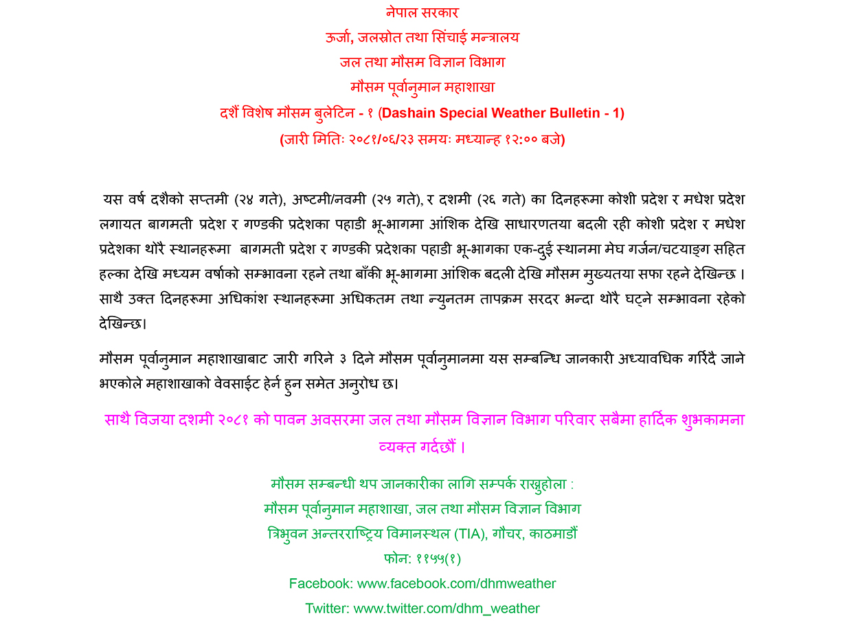 बुलेटिनमा महाशाखाले दशैंको फूलपातिदेखि दशमीको दिनसम्म कोशी र मधेश प्रदेशका थोरै स्थानमा हल्कादेखि मध्यम वर्षाको सम्भावना रहेको जानकारी दिएको छ ।