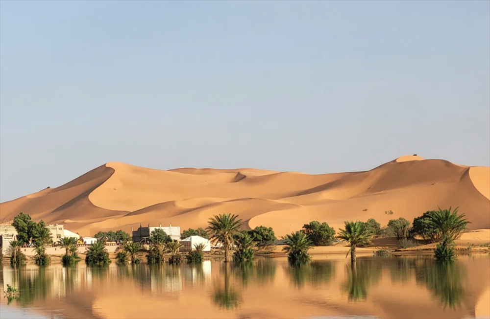 दुई दिनको वर्षाका कारण प्रायः सधैँ बाँझै रहने भूमि अहिले पानीले डुबेका छन् । विज्ञहरूका अनुसार जलवायु परिवर्तन र असामान्य मौसमका कारण यस्तो अवस्था आएको हो । नासाले उपग्रह मार्फत सहाराको बालुवाबाट बग्ने पानी, प्रचीन भवन र मरुभूमिको वनस्पतिको मनोरम तस्बिर खिचेको छ ।