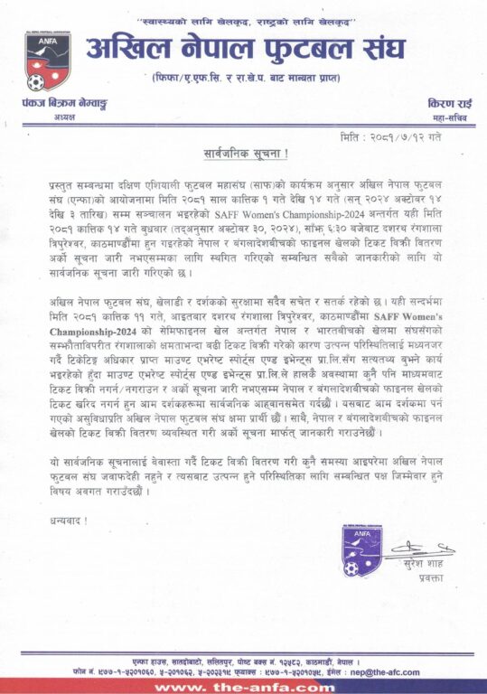 काठमाडौँ । अखिल नेपाल फुटबल संघ ‘एन्फा’ ले बुधबार हुने नेपाल र बंगलादेशबीचको साफ महिला च्याम्पियनसिपको टिकट बिक्रि बन्द गरेको छ ।
