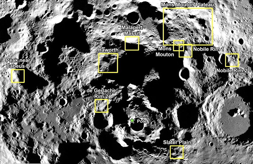 नासाको साइट चयन विश्लेषण टोलीले दक्षिण ध्रुव नजिकै सम्भावित नौं अवतरण क्षेत्रहरू पहिचान गरेको छ । जसमा क्याबियस बी नजिकैको शिखर, हवार्थ, मालापर्ट मासिफ, मोन्स माउटन प्लेट, मान्स माउटन, नोबिल रिम-१, नोबिल रिम- २, डी गेरलाचे रिम र स्लेटर प्लेन रहेका छन् ।