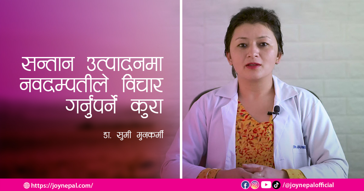 गर्भधारण पश्चात् बच्चा जन्मिने समय र जन्मपश्चात् पनि आमा र बच्चा दुवैको स्वास्थ्यमा समस्या निम्तन सक्छ । यसकारण नव दम्पतीका लागि सन्तानको योजनाका विषयमा महत्वपूर्ण विषयको बारेमा सुमेरु अस्पतालमा कार्यरत स्त्रीरोग विशेषज्ञ डा. सुमी मुनकर्मीसँग जोय नेपालकर्मी सुस्मिता फुयाँलले गरेको कुराकानी: