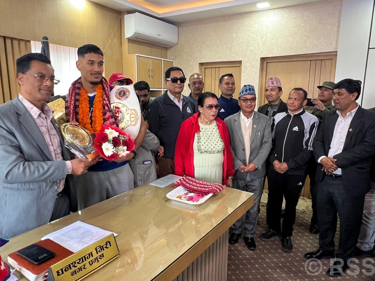 नगरपालिकाले कलंङ्की ‘खड्कुलेपुल’ देखि धिमे,पञ्चेबाजा सहित विश्वविजेता खेलाडी घिमिरेलाई गाडीमा राखेर नगरपरिक्रमा गराएको थियो । सो अवसरमा चन्द्रागिरि नगरपालिकाका प्रमुख घनश्याम गिरी, प्रशासकीय अधिकृत हेमराज अर्याल ,उपप्रमुख बसन्ती श्रेष्ठ, प्रवक्ता कृष्णप्रसाद खड्गीले बक्सर घिमिरेलाई अभिनन्दन गरेका थिए ।