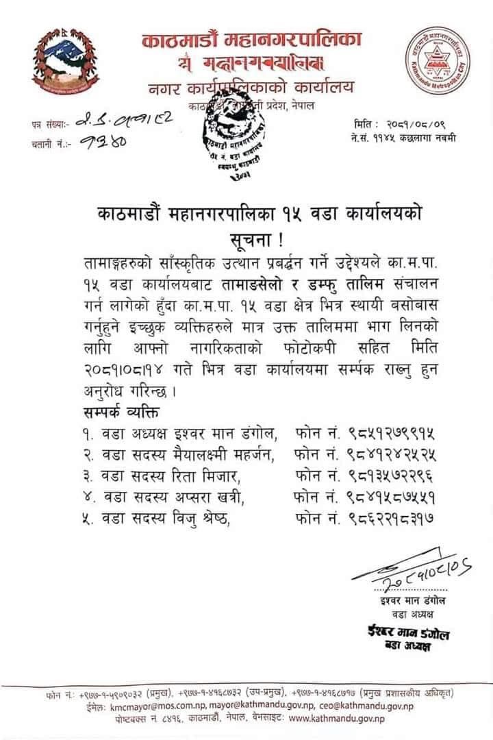 काठमाडौँ– काठमाडौँ महानगरपालिका अन्तर्गत वडा नम्बर १५ ले तामाङसेलो र डम्फु तालिम सञ्चालन गर्ने भएको छ ।