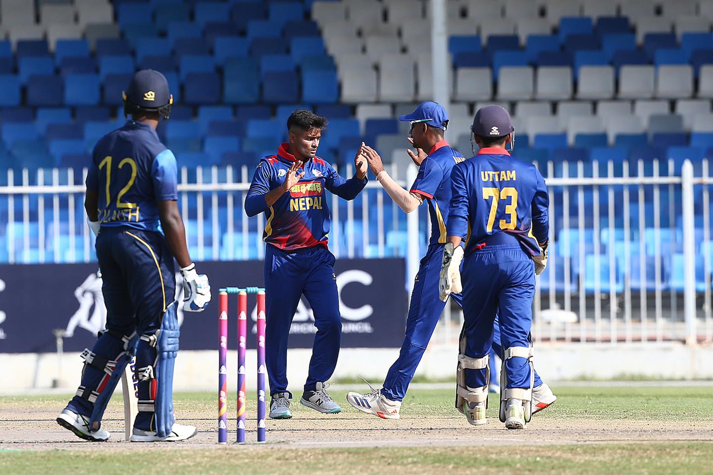 त्यस्तै लकविन अभेसिङ्गेले ५० रन बनाए । कविजा गमागेले ३७ रन बनाए । नेपालका सन्तोष यादवले १० ओभरमा ४५ रन दिएर ४ विकेट लिए । त्यस्तै युवराज खत्रीले २ तथा कप्तान हेमन्त धामी र नरेन साउदले समान १ विकेट लिए ।