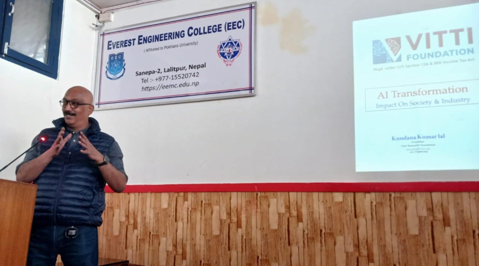 सानेपा ललितपुरस्थित एभरेष्ट इन्जिनियरिङ कलेज र एनडिआरआईको संयुक्त आयोजनामा एभरेष्ट इन्जिनियरिङ कलेजको सभाहलमा भएको कलेजका शिक्षक तथा विद्यार्थीहरूसँगको छलफल कार्यक्रममा भारतको मुम्बईस्थित भिट्टी रिसर्च इन्स्टिच्युटका अध्यक्षसमेत रहेका उनले अहिलेको समय सूचना प्रविधिको युग भएको, मानव जीवनका सबै आयामहरूमा एआईको प्रयोग तीव्र गतिमा बढिरहेकोले यस विषयमा नेपालीहरु गम्भीर हुन सुझाए ।