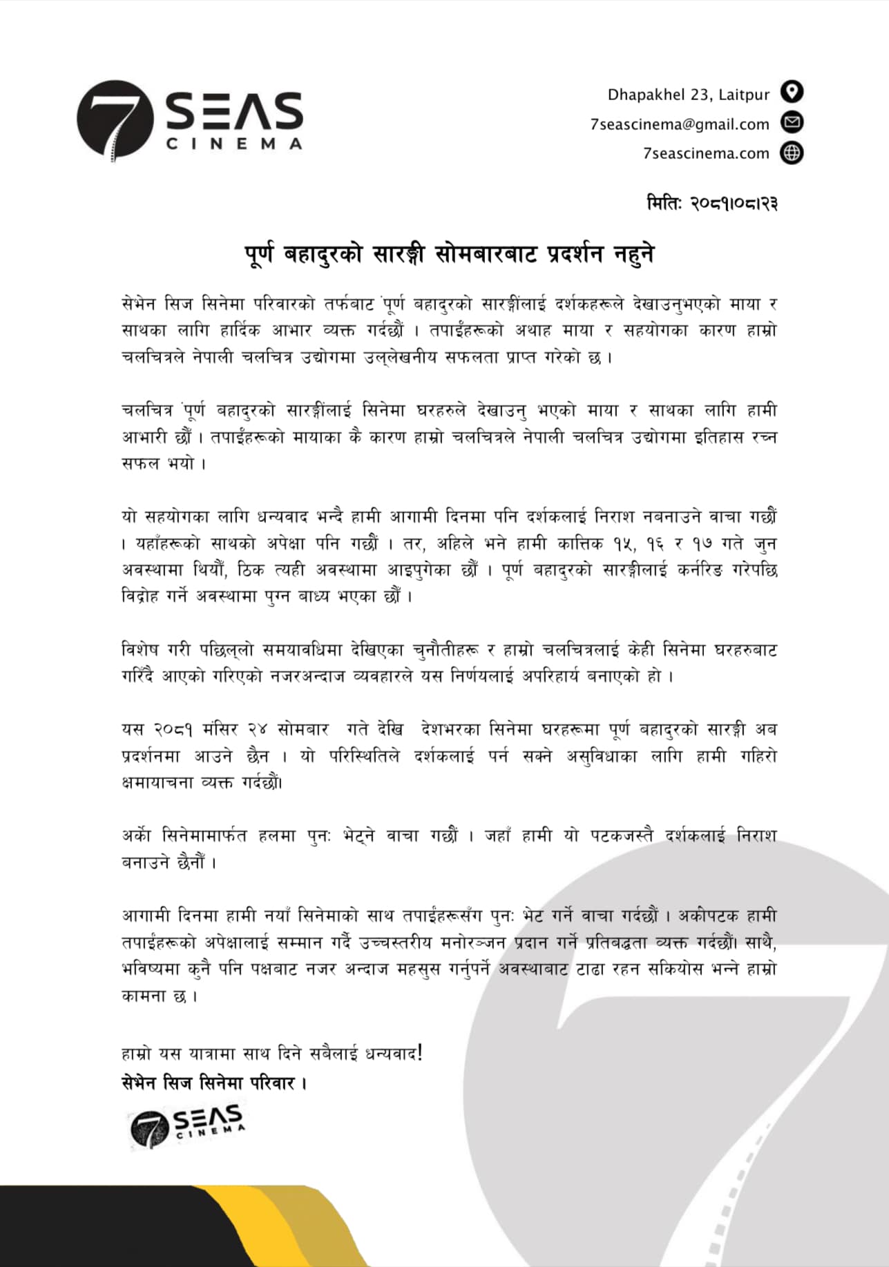 ‘चलचित्र पूर्ण बहादुरको सारङ्गीलाई सिनेमा घरहरुले देखाउनुभएको माया र साथका लागि हामी आभारी छौँ । तपाईँहरुको मयााकै कारण हाम्रो चलचित्रले नेपाली चलचित्र उद्योगमा इतिहास रच्न सफल भयो,’ निर्माण टिमले जारी गरेको विज्ञप्तिमा भनिएको छ ।