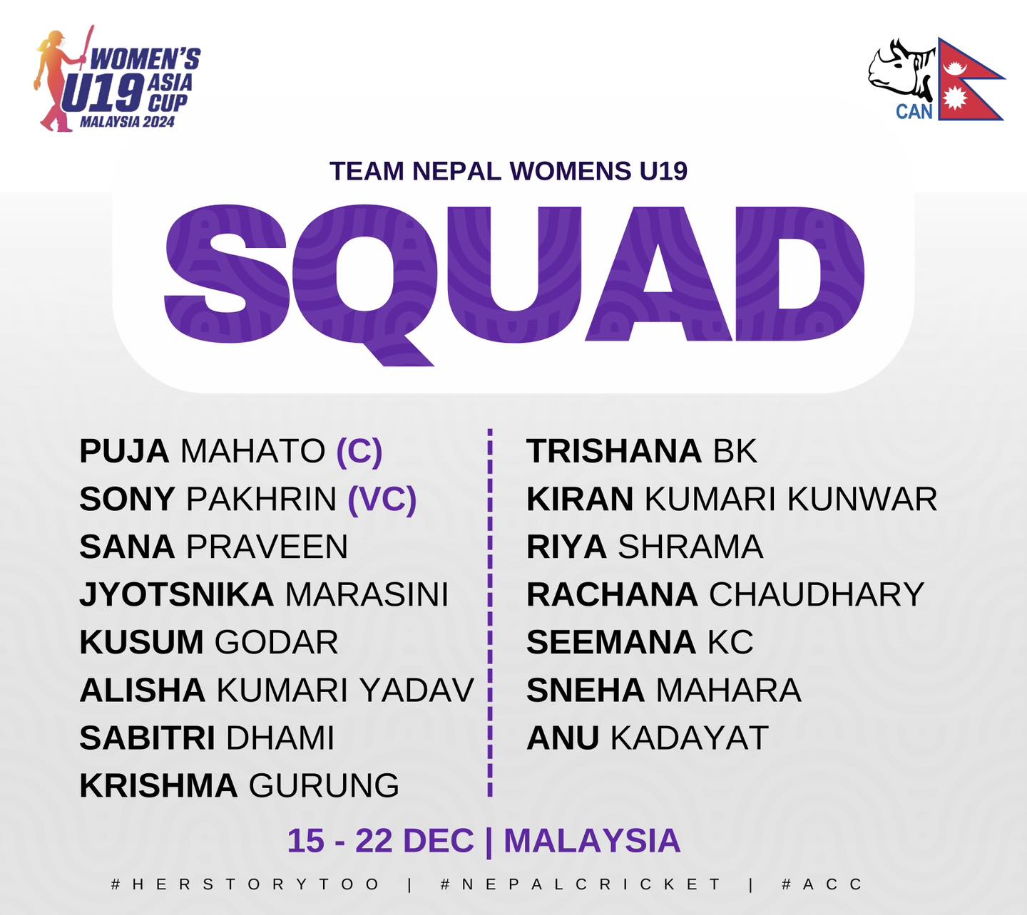 पूजा महतोको कप्तानीमा १५ सदस्यीय टोली घोषणा गरिएको हो । टोलीको उपकप्तानमा सोनी पाख्रिन तथा अन्य खेलाडीमा, साना प्रवीन, ज्यात्स्निका मरासिनी, कुसुम गोदार, एलिशाकुमारी यादव, सावित्री धामी, कृष्मा गुरुङ, तिर्सना विश्वकर्मा, किरणकुमारी कुँवर, रिया शर्मा, रचना चौधरी, सिमाना केसी, स्नेहा महरा र अनु कडायत छन् ।