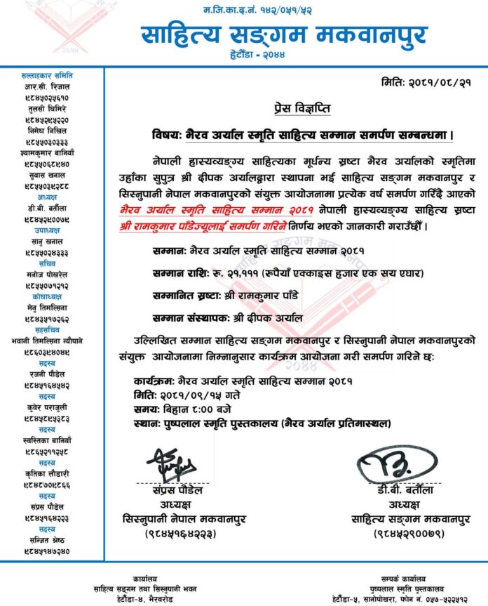 सिस्नुपानी नेपाल मकवानपुर र साहित्य सङ्गम मकवानपुरले हालै संयुक्त विज्ञप्ति जारी गर्दै वि.सं.२०८१ को ‘भैरव स्मृति साहित्य सम्मान’ पाँडेलाई प्रदान गर्ने घोषणा गरेको हो ।
