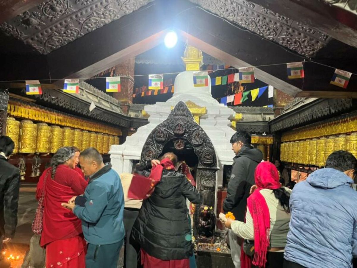 स्वयम्भूमा मञ्जुश्रीको दर्शन तथा सरस्वतीको पूजा गर्ने भक्तजनको घुइँचो