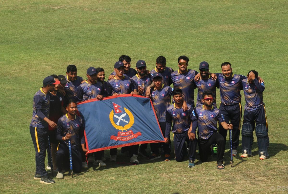 त्यसअघि भैरहवास्थित सिद्धार्थ क्रिकेट रङ्गशालामा टस हारेर ब्याटिङको निम्तो पाएको आर्मीले ४३ ओभरमा सबै विकेट गुमाउदै १५४ रन बनाएको थियो । २५ रनमै ५ विकेट गुमाएको आर्मीका लागि कप्तान विनोद भण्डारी र वसीर अहमदले ७५ रन बढीको साझेदारी गरेका थिए ।
