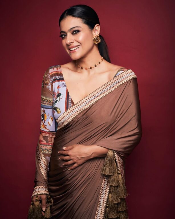 अभिनेत्री काजोलको फुल स्लिभ प्रिन्टेड ब्लाउजले पनि उत्कृष्ट लुक दिनेछ। उनको ब्लाउज खैरो र हल्का नीलो रंगको छ। तपाईं यस प्रकारको ब्लाउज मिल्दो रंगको सादा साडीसँग लगाउन सक्नुहुन्छ। उनको जर्जेट साडी धेरै सुन्दर देखिन्छ। काजोलले लुकसँग मेल खाने गरी नग्न रंगको मेकअप गरेकी छिन्।