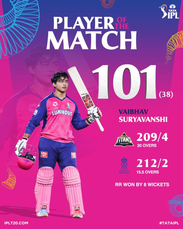 गुजरात विरुद्ध २१० को लक्ष्य पछ्याउँदै सूर्यवंशी आक्रमण गर्न तयार थिए। उनले अनुभवी इशान्त शर्माको ओभरमा तीन छक्का र दुई चौका प्रहार गर्दै केही अतिरिक्तसहित बनाएर २८ रन बनाए । उनले वासिङ्टन सुन्दरको बलमा दुई छक्का र एक चौका प्रहार गर्दै ५० रनको कोसेढुङ्गा पुरा गरेका थिए ।