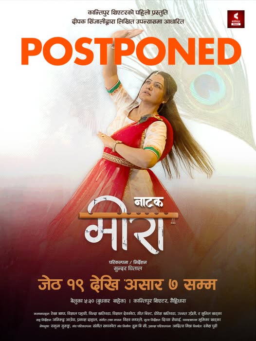 काठमाडौँ – रेखा थापा अभिनित नाटक ‘मीरा’ पोस्टपोण्ड भएको छ । आजको असहज राजनितीक परिस्थितीका कारण हामीले आजको लागि तय गरिएको ‘कान्तिपुर थिएटर’ को उद्घाटन तथा नाटक ‘मीरा’ को प्रिमीयर दर्शक, कलाकार तथा अतिथीहरुको सुझाव र सुरक्षालाई मध्यनजर गर्दै हाललाई स्थगित गरिएको जनाइएको छ।