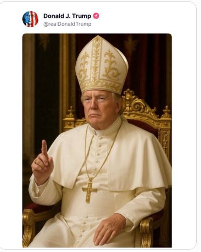 शुक्रबार राति ट्रम्पले पोस्ट गरेको तस्बिरमा उनले सेतो क्यासक र पोइन्टेड मिटर लगाएका छन्, परम्परागत रूपमा विशपले लगाउने जस्तो। र, उनले आफ्नो घाँटीमा ठूलो क्रस लगाएका छन र र आफ्नो औंला समातेको छ, त्यसमाथी गम्भीर अनुहारको अभिव्यक्तिको साथ।