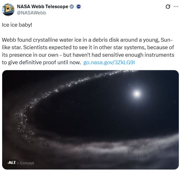 वैज्ञानिकहरूका अनुसार जेम्स वेबले बरफ मात्र होइन, क्रिस्टलीय पानीको बरफ पनि पत्ता लगाएका छन् । अर्थात्, यस्तो बरफ हाम्रो सौर्यमण्डलको शनि ग्रहको छल्ले र कुइपर बेल्टमा पाइन्छ। यो हिउँसँगै धुलोका सूक्ष्म कणहरू पनि छन्, जसले मिलेर ‘फोहोर स्नोबल’ जस्तो संरचना बनाउँदै छन् । यो बरफ र लो मिलेर पछि ग्रह बन्न सक्छ । र जसरी उल्का र धूमकेतुहरूबाट पानी हाम्रो पृथ्वीमा पुग्यो, त्यसरी नै पानी पनि त्यहाँ पुग्न सक्छ।