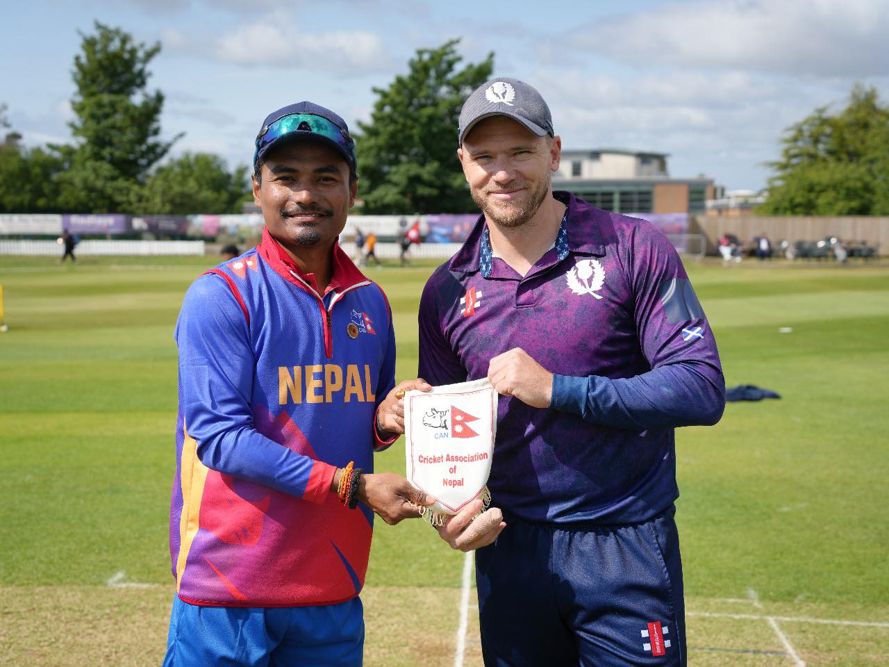 काठमाडौँ – आइसिसी विश्वकप लिग–२ अन्तर्गत चौथो चरणको आफ्नो पहिलो खेलमा नेपालले टस जितेको छ । स्कटल्यान्डको डुन्डेस्थित फोर्टहिल क्रिकेट मैदानमा नेपाली टोलीका कप्तान रोहितकुमार पौडेलले टस जितेर पहिला फिल्डिङ रोजेका छन् । त्रिकोणात्मक एक दिवसीय उक्त शृङ्खलामा नेपाल र स्कटल्यान्डसँगै नेदरल्यान्डस् रहेको छ ।