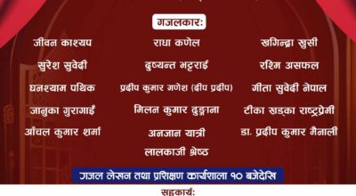 काठमाडौं – झापाको बिर्तामोडमा पहिलो पटक गजलसम्बन्धी विशेष कार्यक्रम हुने भएको छ । नेपाल गजल