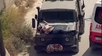 इजरायली सैनिकको ज्यादति : घाइते प्यालेस्टाइनीलाई गाडीको हुटमा बाँधियो