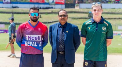 आयरल्याण्ड वोल्भ्सविरुद्ध टस हारेर नेपाल ए ले पहिला ब्याटिङ गर्दै